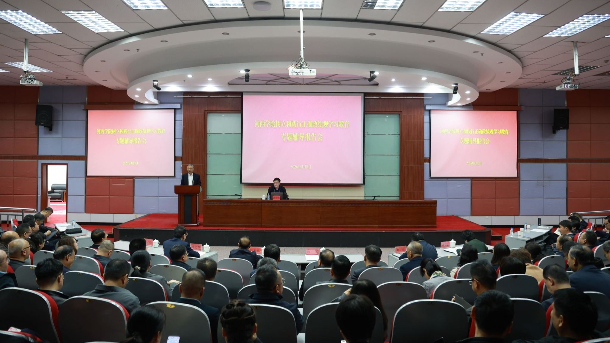 4月3日,学校举办树立和践行正确政绩观学习教育专题辅导报告会,北京师范大学李宏伟教授应邀作题为《坚持正确政绩观,汇聚强国建设力量》的专题辅导。党委副书记高荣主持报告会。学校领导班子成员、全校处级以上干部及党支部书记参加。