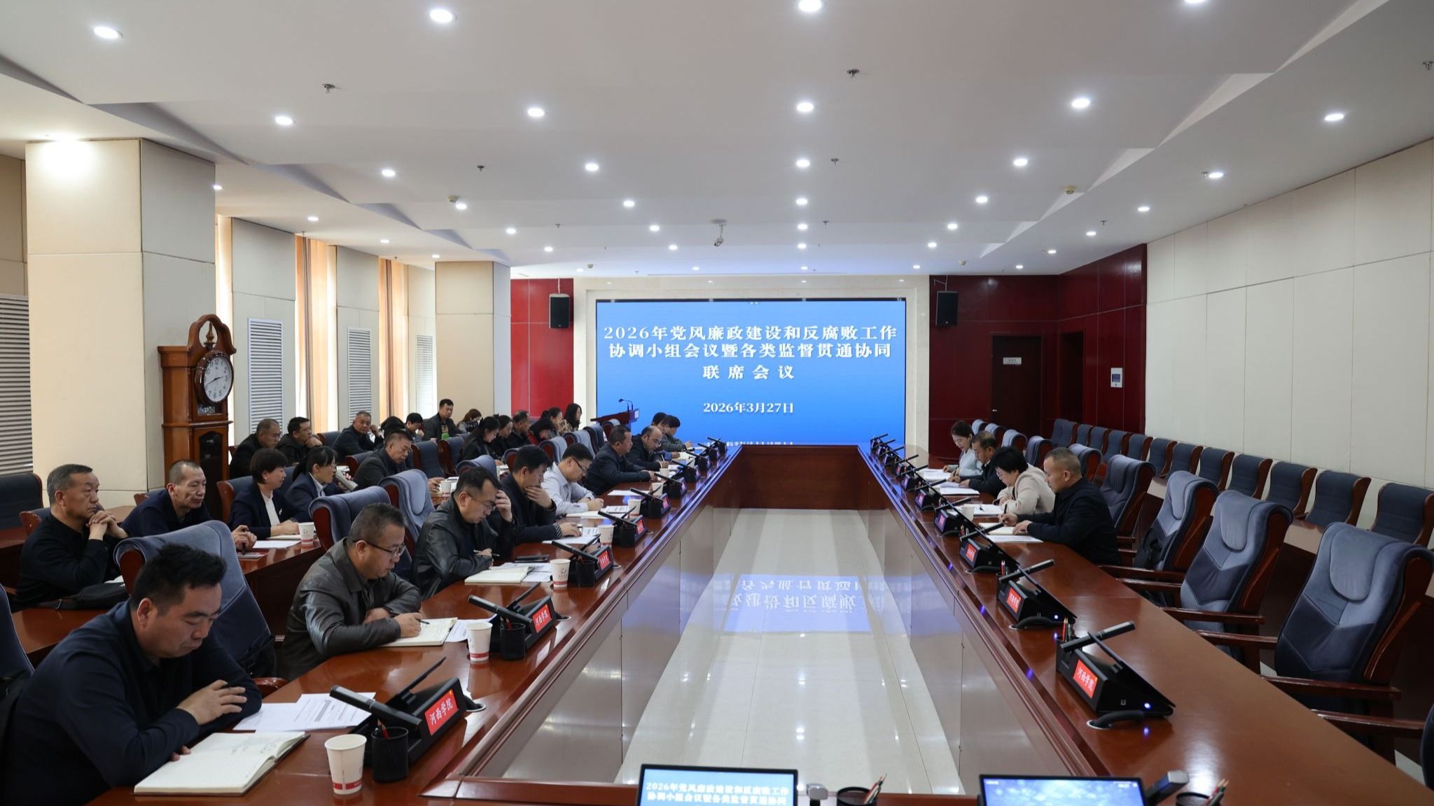 3月27日,学校召开2026年党风廉政建设和反腐败工作协调小组会议暨各类监督贯通协同联席会议。学校党委常委、纪委书记、监察专员殷大斌出席会议并讲话,协调小组成员单位负责人及相关部门负责人参加会议。