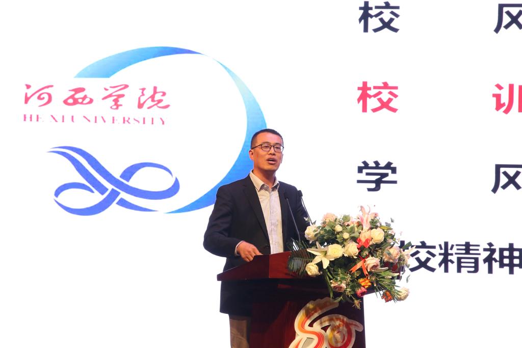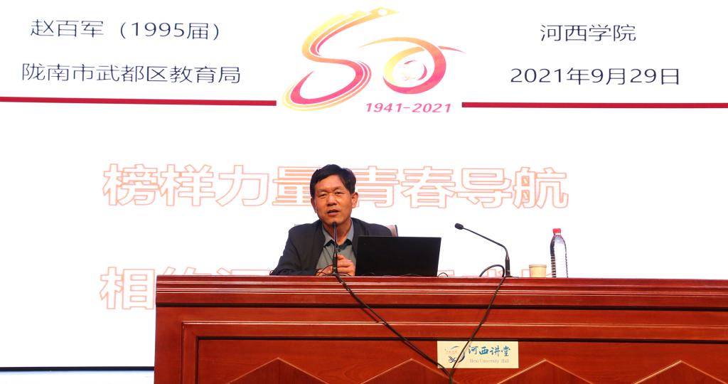 96届校友、甘肃省优秀教师、甘肃省“五一”劳动奖章获得者,现任陇南市武都区教育局副局长赵百军作了题为“榜样力量 青春导航 相约河院 共话成长”的报告。他用自己的成长经历,讲述了一名基层教育工作者的责任和担当。他当老师,能做到家访每个学生,能做到亲自批阅学生的每一次作业和试卷,用艰苦奋斗的创业者精神,他一路带出最好的班,带出最好的学校,成为中学高级教师和优秀校长。他说,“我可以拍着胸脯说,我没有给母校丢人”。