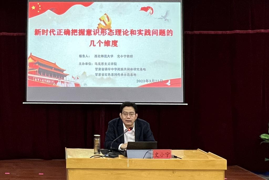 3月23日下午,马克思主义学院邀请西北师范大学马克思主义学院院长、博士生导师史小宁教授为学院师生作了题为“新时代正确把握意识形态理论和实践问题的几个维度”的学术报告。学院全体师生参加了报告会。