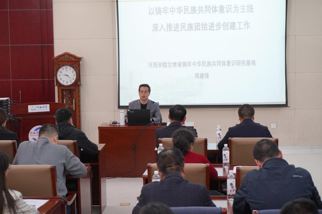 开班仪式结束后,河西学院马克思主义学院周建强博士为培训学员作了“习近平总书记关于加强和改进民族工作的重要思想与民族团结进步示范单位创建的重要意义”的专题讲座。