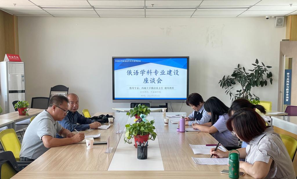 6月2日,外国语学院召开专业建设座谈。西南大学外国语学院副院长褚修伟教授、俄语系主任谢周教授、英语教育系主任唐瑞梁副教授应邀参加。