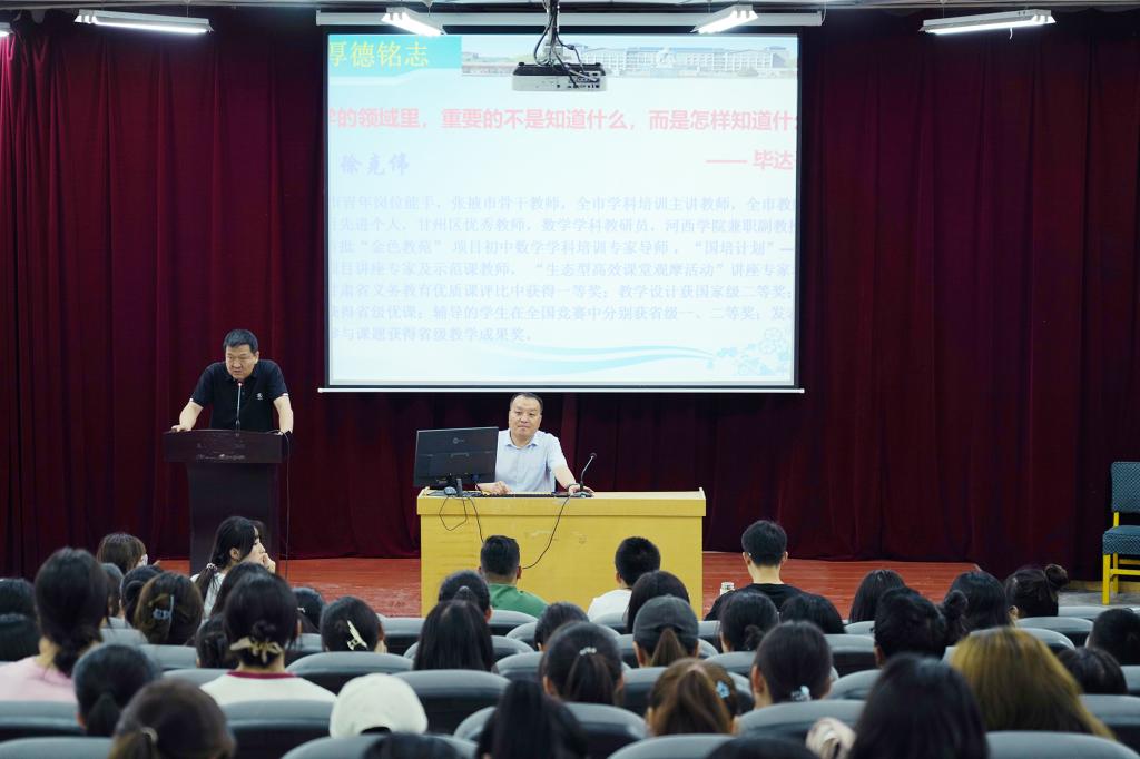 6月13日上午,甘州区大成学校校长徐克伟作了题为“教师专业成长及课堂教学实践与思考”的报告。徐克伟老师结合自己从教经历向同学们介绍一名教师的成长路径,指出要成为一名“专业化”教师,我们要具备将“压力”化为弹力的能力,要具备道德素养、专业知识、教育能力等素养。在实际的课堂教学中,要从意识-习惯-能力-精神四个层次来提高自己,形成自己在教学中的独特人格。