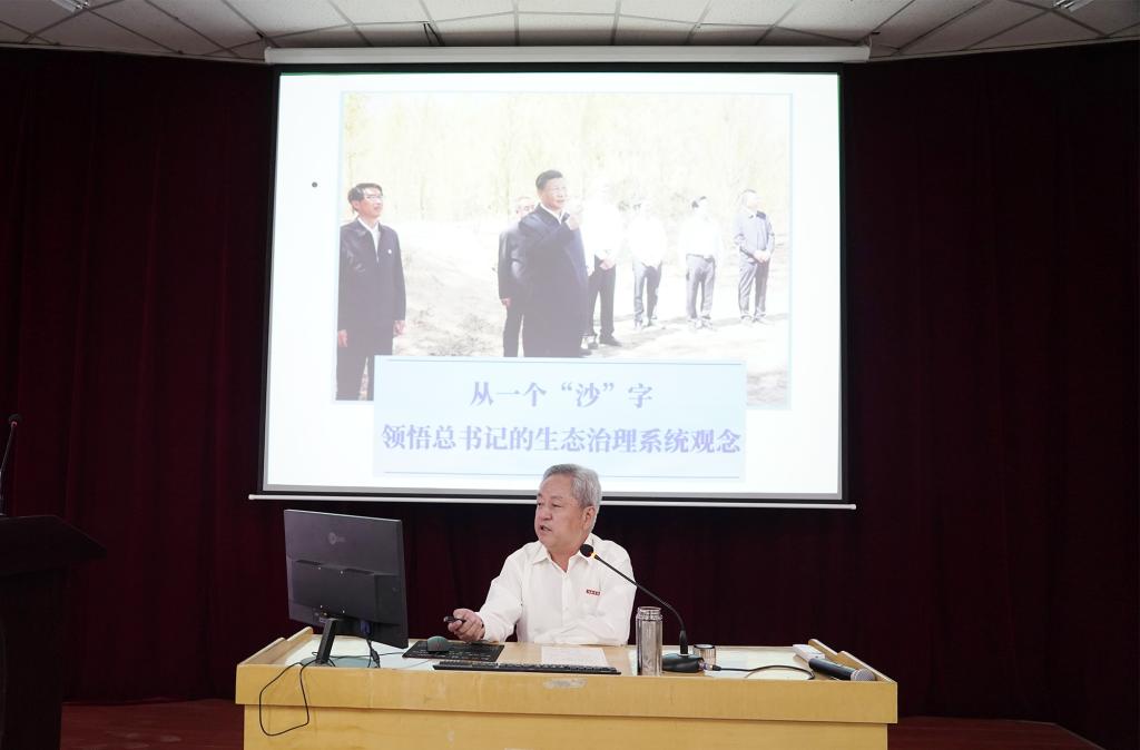 报告会上,杨有海教授以“风沙灾害防治及太中银铁路治沙研究”为题,辅导学习习近平总书记在内蒙古巴彦淖尔考察并主持召开加强荒漠化综合防治和推进“三北”等重点生态工程建设座谈会重要讲话精神,分析沙漠化问题,讲解风沙物理学原理和植物治沙的基本原理,采用工程措施防沙治沙理论和实践,以及太中银铁路沙害特点及防治措施研究成果等。报告图文并茂,给与会人员上了一堂科普课、理论联系实际的科研实践课,融治沙领域科学家精神和“八步沙”精神等在内的思政课。他提出全体师生要向书本学习、向实践学习、向专家学者学习、向社会学习、向人民群众学习,希望同学们学会学习、学会思考、学会实践、学会创新,勤奋学习,刻苦钻研,深入研究,报效祖国。