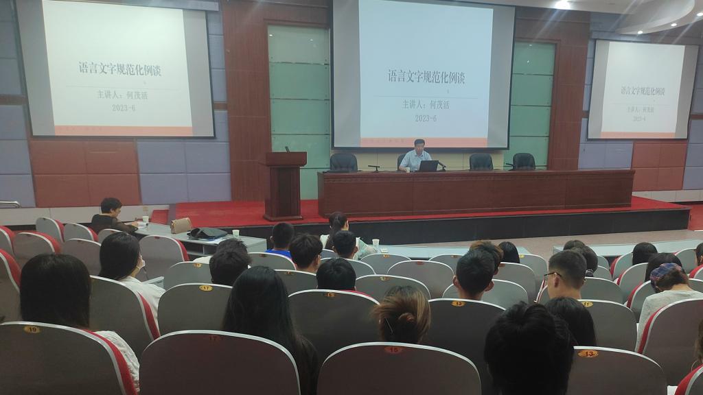 何茂活教授作了题为“语言文字规范及应用写作例谈”的学术报告。报告分两部分内容:一是介绍《中华人民共和国国家通用语言文字法》《通用规范汉字表》《普通话异读词审音表》等语言文字规范标准;二是结合学生语言文字应用的实际,指出其中常见的问题。通过上述内容,力图使学生增强语言文字规范意识,自觉提升语言文字应用的能力与水平。本次报告对培养师生语言文字规范化意识和提升语言文字的运用能力具有重要促进作用。