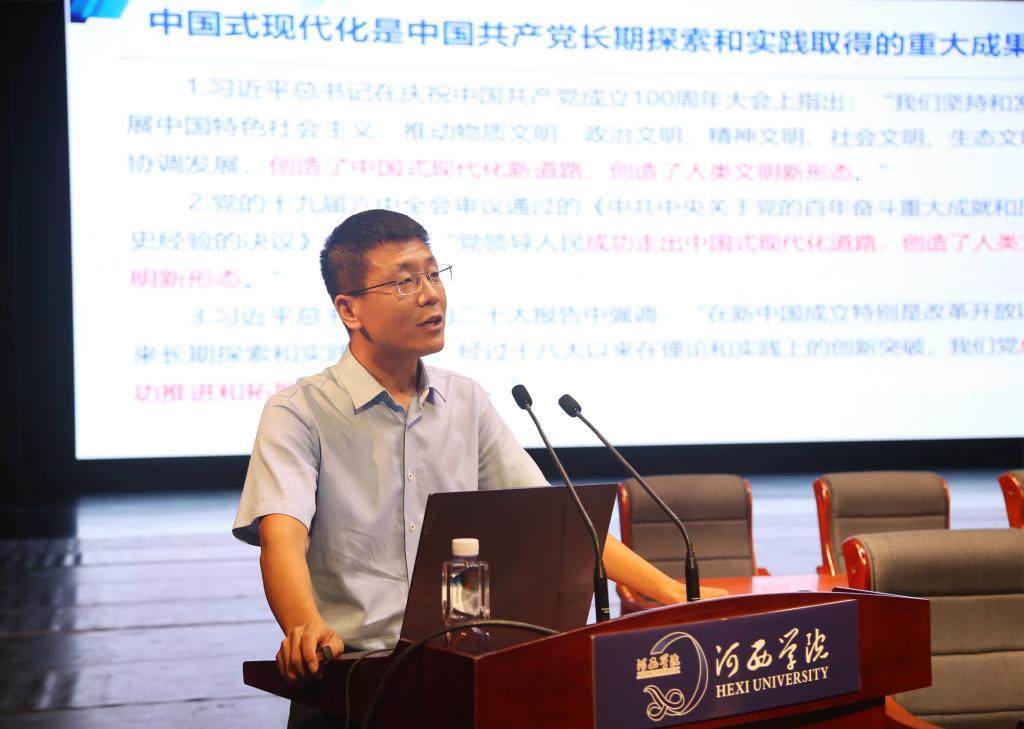 7月11日上午,参加师范教育协同提质计划工作推进会的山东师范大学马克思主义学院院长、博士生导师王增福教授在河西讲堂观众厅作了题为“以中国式现代化全面推进中华民族伟大复兴”的学术报告。全校各学院师生800余人参加了报告会。