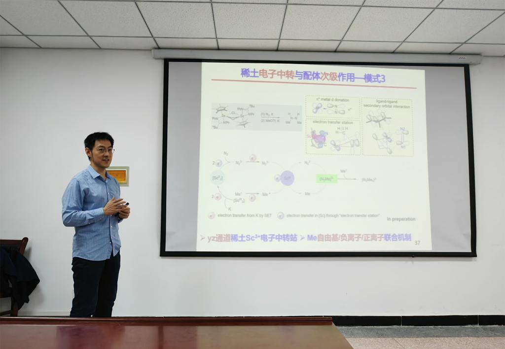 彭谦研究员任国家级一流课程《结构化学》主讲教师,并主持2项国家级教学改革项目。报告中,他首先以环己烷的构型反转机制为例,就《结构化学》教学中如何将科研手段与教学有效结合讲述了自己的工作成果。随后,以稀土有机配合物与N2作用的理论研究为例,讲述了稀土氮气配合物的电子性质,稀土电子中转与配体次级作用模式,从而阐明稀土有机配合物在新物质创造中发挥的独特作用。报告结束后,还和学院老师进一步交流,讨论了化学专业2023版人才培养方案。