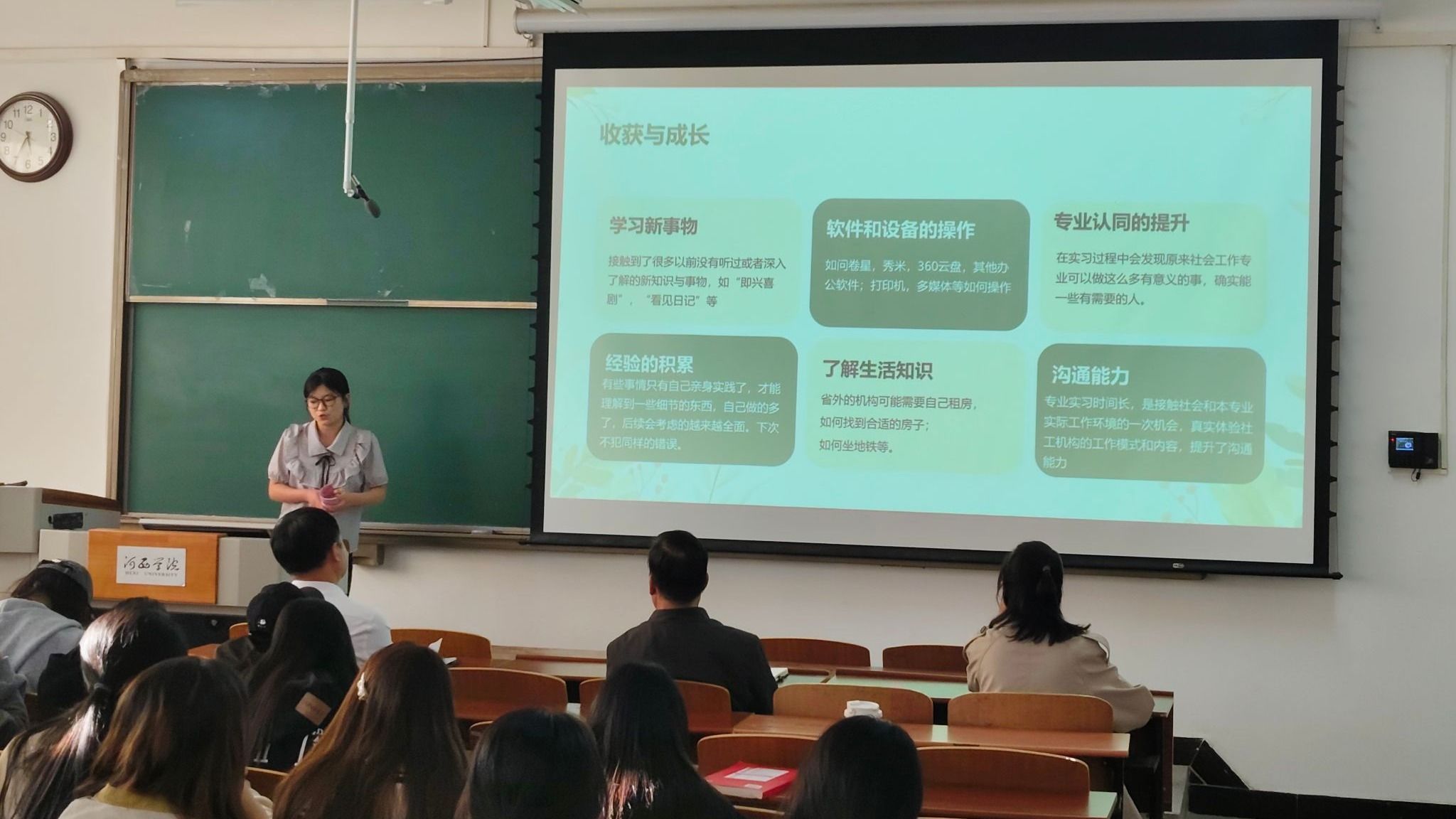会上,社会工作负责人代表学院就本年度专业实习工作做了总结。7位优秀实习生代表分享实践收获,教师代表从专业成长角度点评实习,肯定了学生在专业价值内化、知识运用方面的收获与反思,鼓励大家认真回顾专业实习过程,通过交流研习持续提升专业技能。