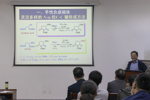 黄培强教授以“生物碱的高效合成方法学”为题,介绍了灵活多样的N-α位C-C键形成方法、酰胺直接转化化学和生物碱不对称合成方法。通过生动有趣的科研故事,给予学生们充分的鼓励。黄教授指出,科学研究离不开兴趣和钻研;同学们的聪明才智是了不起的,英雄不问出处,只要愿意做就可以做很多事情;同时希望老师们做科研实事求是,立足现有条件,去争取更好的条件。