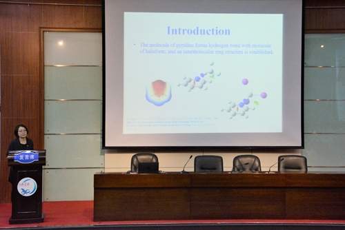 范海燕教授作了题为《Spectroscopic study on the pyridineinvolved intermolecular interaction》的报告,介绍了用分子光谱来研究吡啶参与的分子间作用力,用红外光谱与量化计算相结合来研究吡啶与卤仿之间的氢键作用力。研究发现吡啶与卤仿形成吡啶氮与卤仿氢,和吡啶邻位氢与卤仿卤原子之间通过氢键形成了一个分子间的环状结构,并讨论了该环状结构如何影响吡啶环呼吸的振动频率以及全氟/氯代吡啶与吡啶之间相互作用及高分子化的紫外可见,傅立叶红外的研究工作。