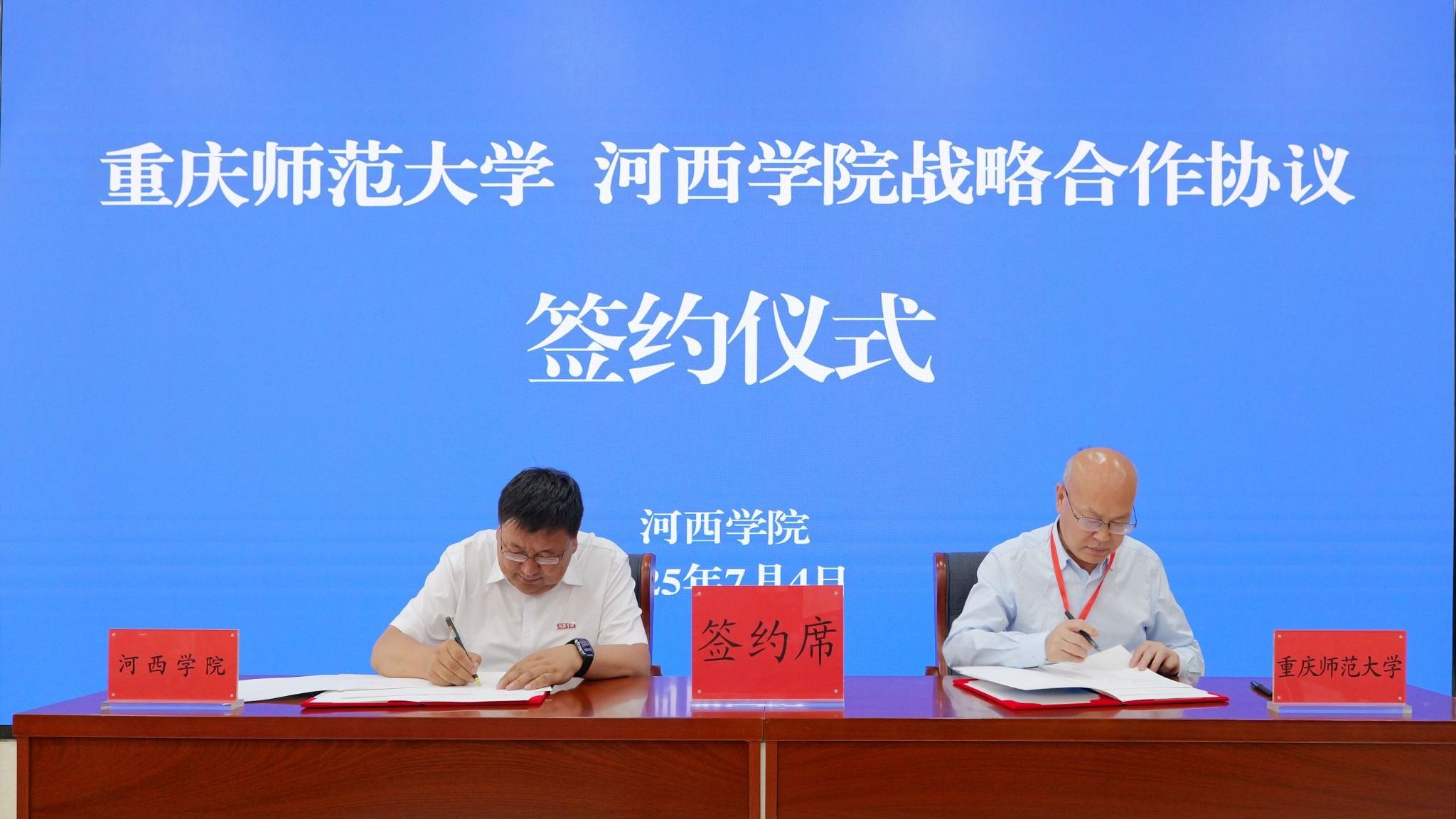教育部师范教育协同提质计划西南大学组团工作推进会暨数智时代教师教育转型发展学术论坛开幕仪式和2025年组团工作推进会由河西学院党委常委、副校长赵柱主持,河西学院校长李广、甘肃省教育厅教师工作处副处长凤宏伟、西南大学校长助理郑元杰致辞。组团内七所高校和西北师范大学分别汇报了师范教育协同提质计划工作进展情况、特色亮点和下一步工作计划,西南大学校长助理郑元杰作总结发言,对深化人才发展战略、优化学科专业布局、提升人才培养质量、深化协同教研机制、加强基础教育服务能力等重点领域的十五项具体任务进行了安排部署。期间,重庆师范大学党委常委、副校长杨如安和河西学院党委常委、副校长赵柱共同签署《重庆师范大学、河西学院战略合作协议》,进一步拓展和深化组团高校间的深度合作和交流机制。