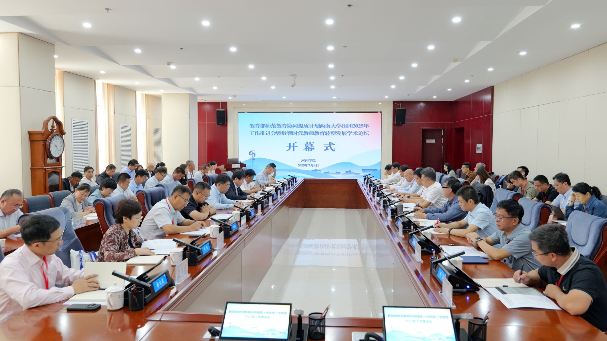 7月4日,教育部师范教育协同提质计划西南大学组团2025年工作推进会暨数智时代教师教育转型发展学术论坛在河西学院召开。本次会议旨在深入学习贯彻党的二十届二中、三中全会和全国教育大会精神,全面落实习近平总书记关于教育的重要论述和《教育强国建设规划纲要(2024-2035年)》关于大力弘扬教育家精神、建设高素质专业化教师队伍的战略部署,安排部署教育部师范教育协同提质计划西南大学组团2025年下半年重点工作,确保组团各项帮扶建设任务高质量完成。甘肃省教育厅教师工作处负责同志,师范教育协同提质计划西南大学组团各高校及西北师范大学校领导、相关部门负责同志、教师教育研究专家出席会议。