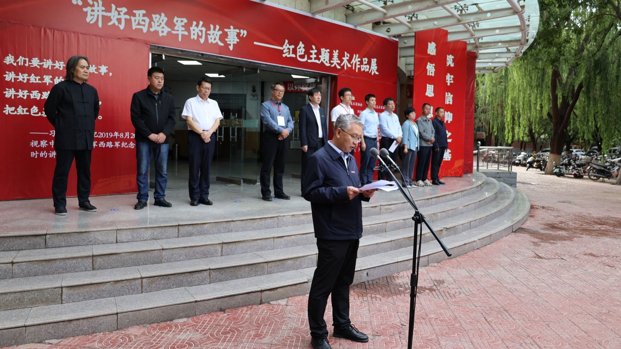 7月4日上午,由河西学院与山东师范大学联合主办“讲好西路军的故事”红色主题美术作品展在河西学院大学生美术馆开幕。河西学院党委副书记、校长李广,西南大学校长助理(山东师范大学党委常委、副校长)郑元杰,甘肃省教育厅教师工作处副处长凤宏伟,山东师范大学党委常委、宣传部部长于晓明,河西学院党委常委、宣传部部长褚建霞及张掖市美协、甘州区美协、中国工农红军西路军纪念馆等单位负责人出席活动。河西学院党委常委、副校长高荣和山东师范大学党委常委、副校长张茂聪分别致辞,河西学院党委常委、副校长王新华主持开幕式。