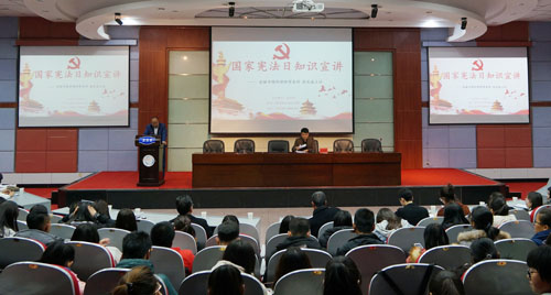 12月4日,法学院在图书馆学术报告厅举行了国家宪法日知识宣讲活动,邀请甘肃锦舒律师事务所主任张龙庭律师作了题为“宪法权利与律师辩护活动”的专题讲座。本次讲座是法学院祁连法学讲堂第二十一讲。