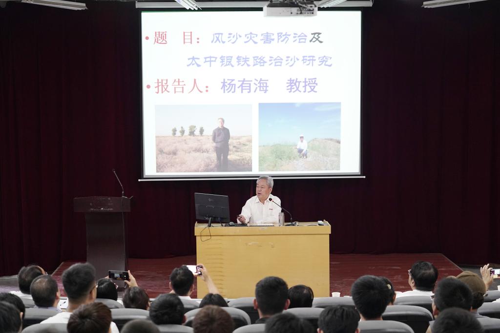 报告会上,杨有海教授以“风沙灾害防治及太中银铁路治沙研究”...