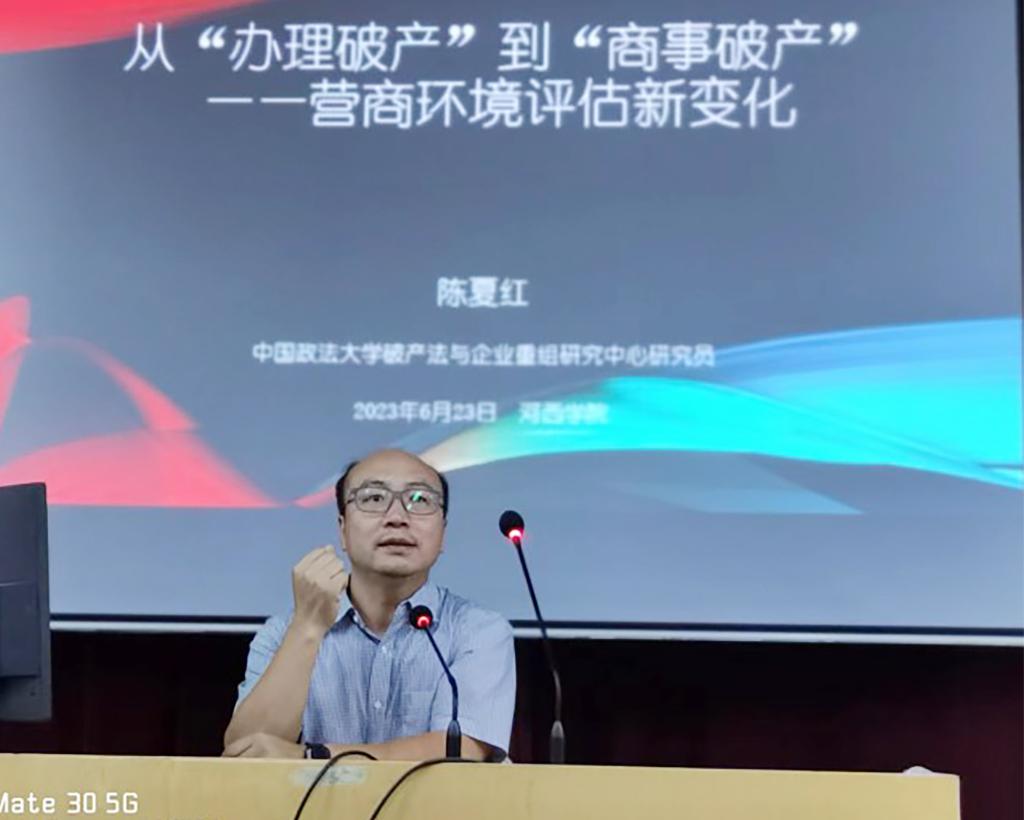 6月21日,法学院邀请中国政法大学破产法与企业重组研究中心研究员、《中国政法大学学报》编辑部主任陈夏红博士来校讲学,并作了“从‘办理破产’到‘商事破产’:营商环境评估新变化”的学术报告,张掖市部分律师、张掖市破产管理人协会的负责人和法学院部分师生代表聆听了报告。...