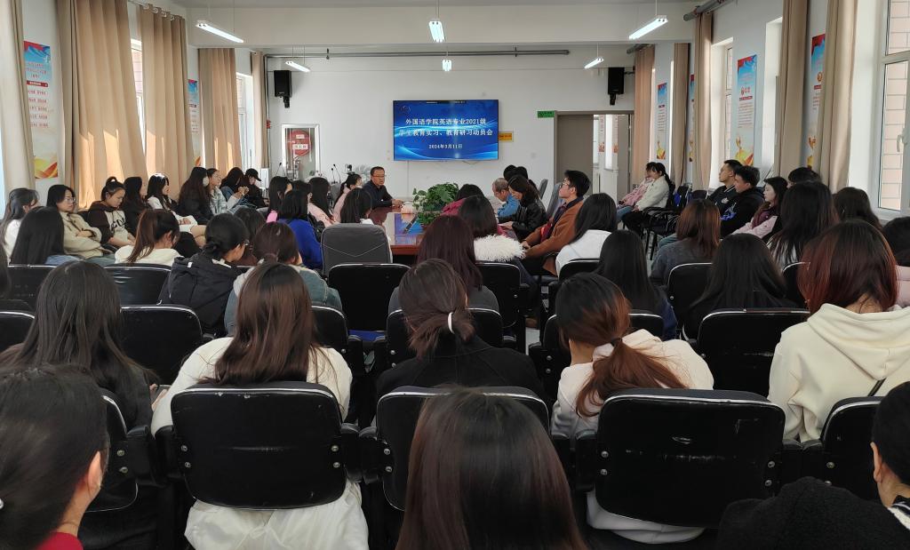 3月11日下午,外国语学院举行了英语专业2021级学生教育实习、教育研习动员大会,学院领导、实践实训教研室成员及2021级全体教师教育方向105名实习学生参加了本次行前动员会。
