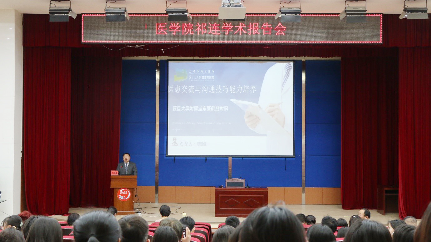 5月7日下午,复旦大学放射科学科带头人、硕士生导师刘新疆教授,应邀为医学院师生作了《医患交流与沟通技巧能力培养》的报告。医学院教师和医学影像技术专业学生共240多人聆听了报告。