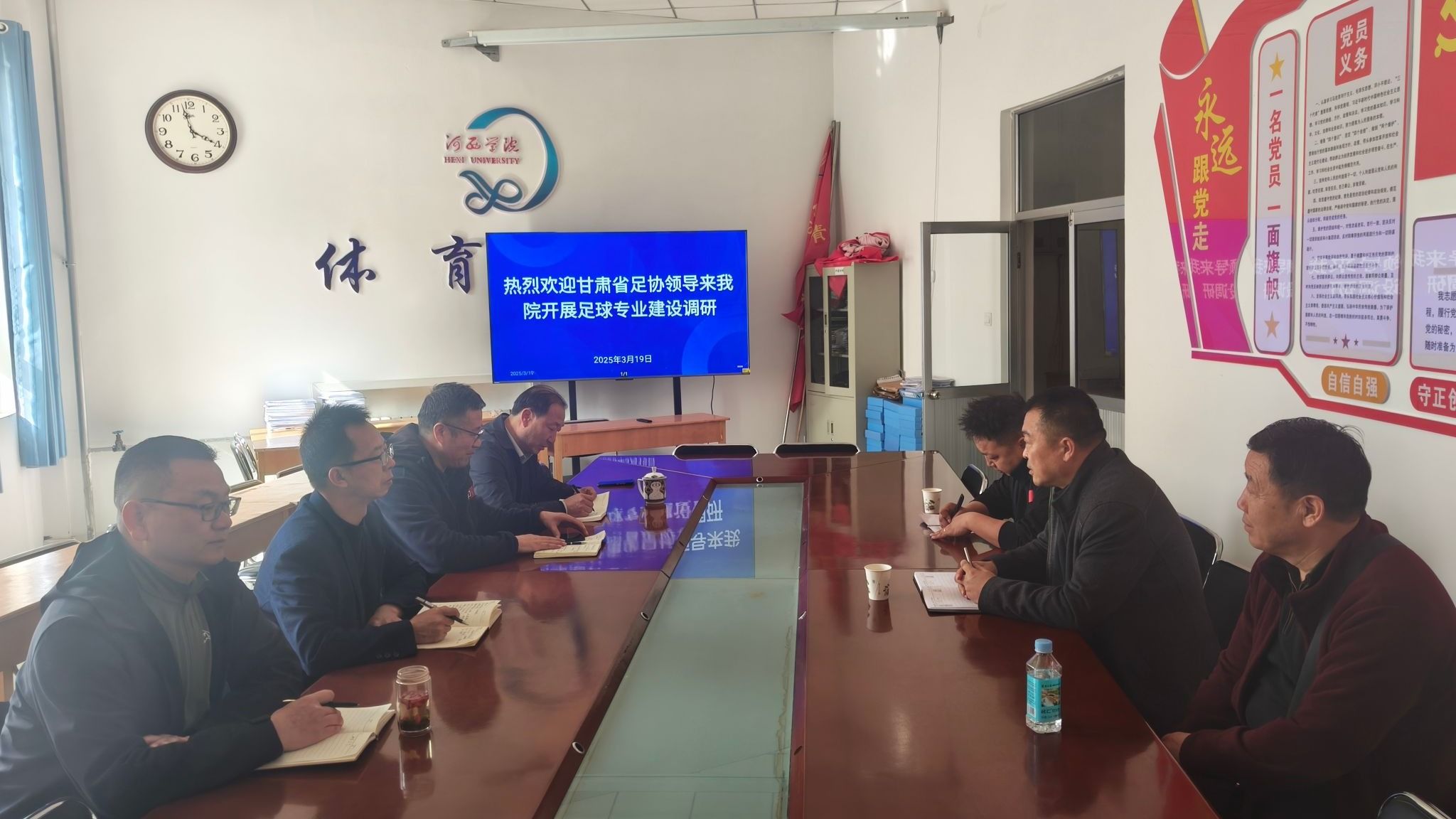 3月19日,甘肃省足球运动协会秘书长张新一行3人来校调研交流,体育学院负责人及足球专业教师参加调研活动。