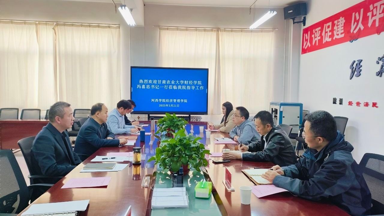 3月21日,甘肃农业大学财经学院党委书记冯喜忠一行来校就党建、学科专业、人才培养及学生就业等工作进行调研交流。经济管理学院负责人、相关科室老师参加座谈会。
