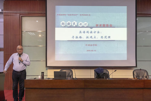 5月12日至13日,应外国语学院邀请,上海外国语大学博士生导师郑新民教授来校进行学术交流,先后在教师发展中心和图书馆学术报告厅作了两场学术报告。报告会由外国语学院负责人主持,300余名学院师生聆听了报告。