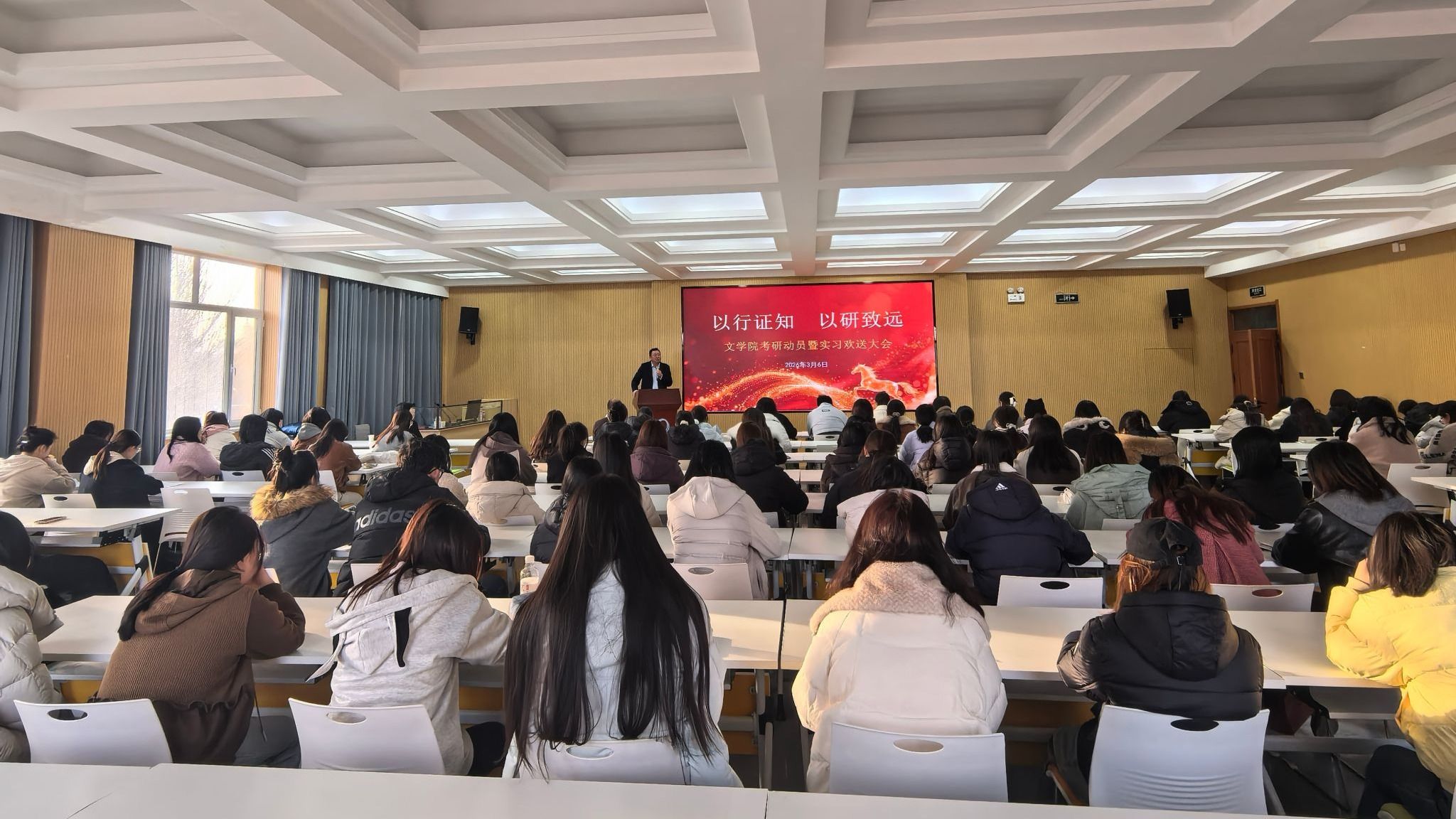 3月6日,文学院举办2023级学生考研动员暨实习欢送大会。会议特邀化学化工学院闫盆吉老师、文学院申旻老师及2025级硕士研究生王思瑜作专题辅导,文学院负责人及2023级全体师生参加。