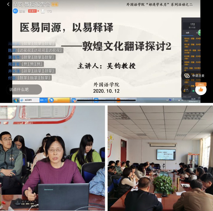 10月12日下午,河西学院“祁连学者”、特聘教授吴钧为外国语学院师生作了题为“医易同源,以易释译---敦煌文化翻译探讨”的学术报告。报告会采用线上线下同步进行的方式,外国语学院全体教师、英语专业高年级学生200余人参加了此次学术交流活动。...
