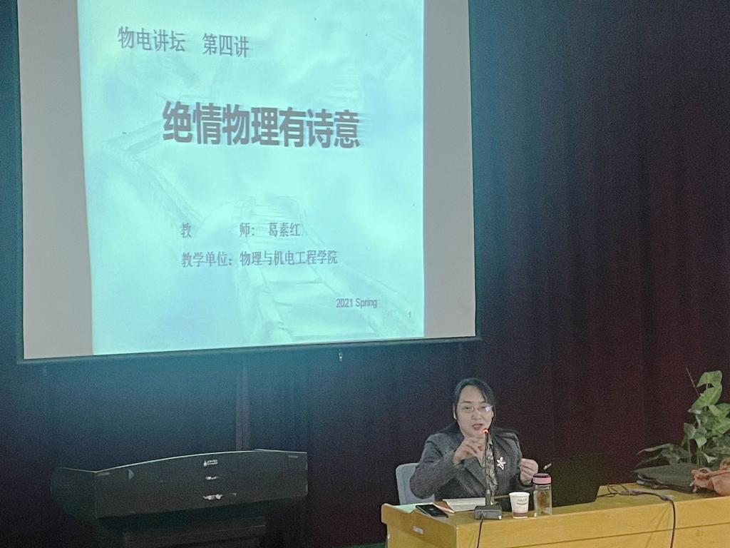 4月15日,由物理与机电工程学院创办的“物电讲坛”第四讲开讲。物理学教授葛素红应邀作了题为“绝情物理有诗意”的报告, 300余名师生参加了报告会。