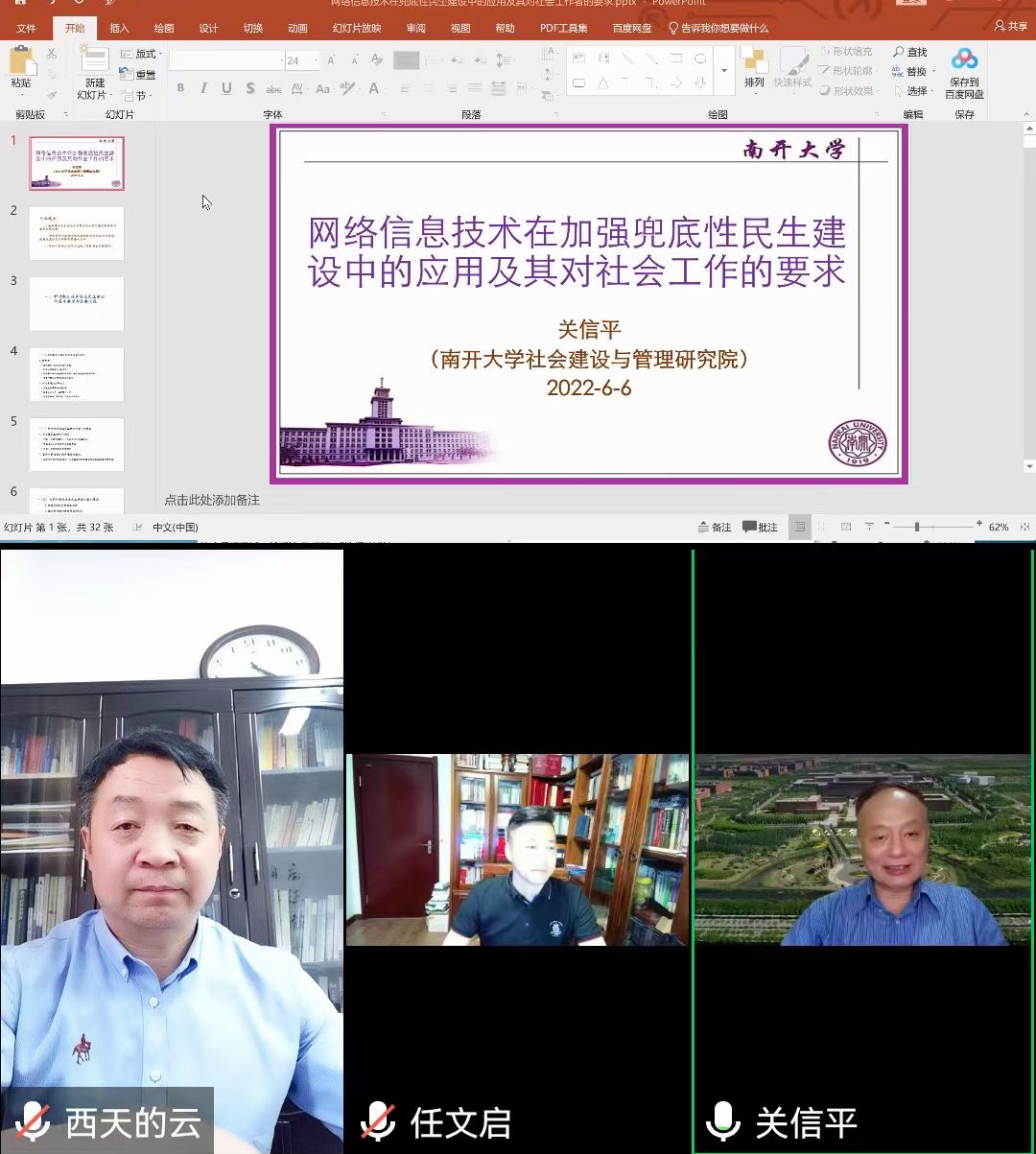 6月6日晚,南开大学社会建设与管理学院院长关信平教授以视频会议形式为法学院社会工作专业师生作了题为“网络信息技术在兜底性民生建设中的应用及对社会工作者的要求”的学术讲座。甘肃政法大学教授任文启教授、法学院负责人和社会工作专业师生聆听。...