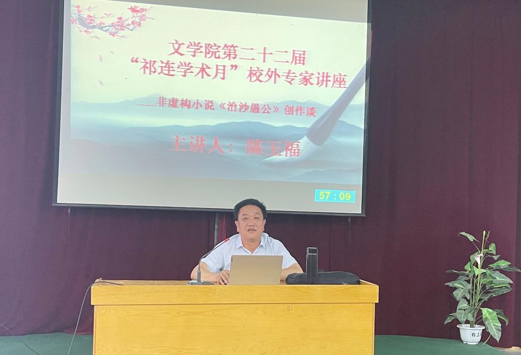 6月1日下午,文学院第22届祁连学术月活动启动,著名编剧、作家陈玉福应邀以“非虚构小说《治沙愚公》创作谈”为题,与文学院师生共同分享了非虚构小说《治沙愚公》创作的过程、经验与体悟。